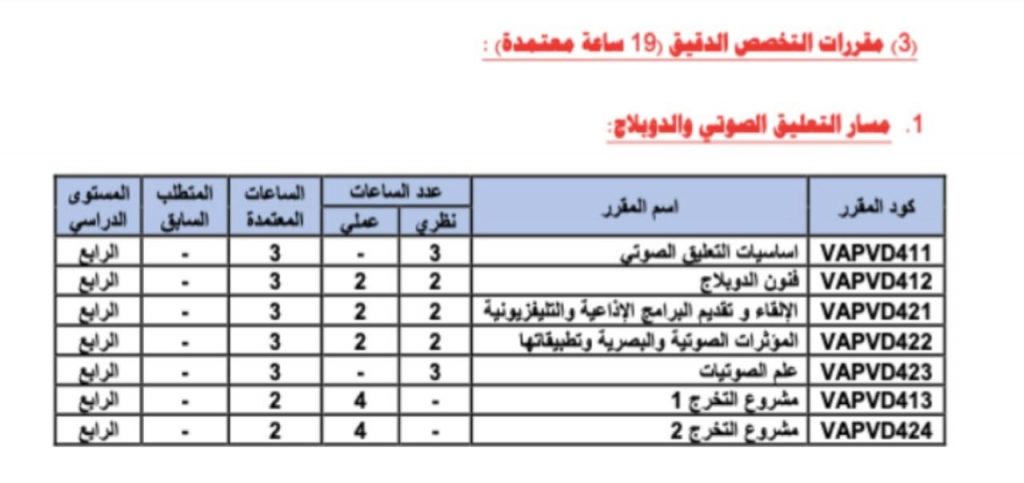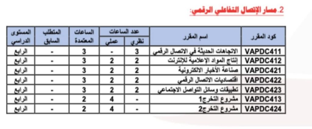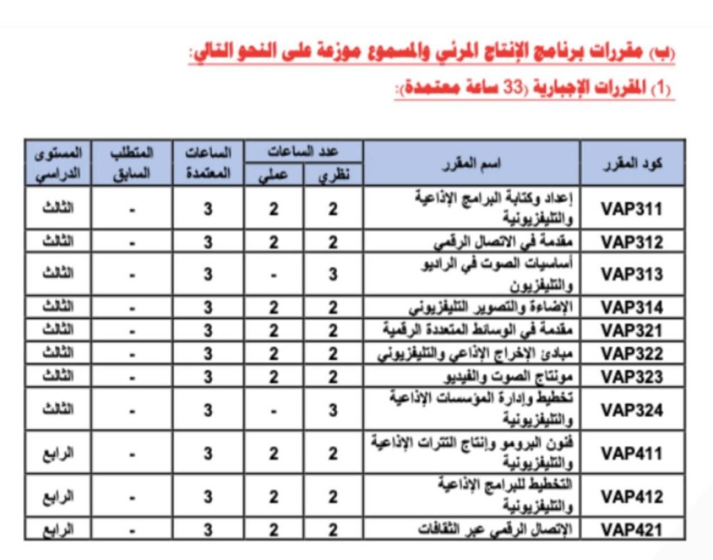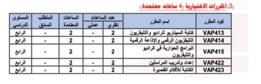 ويُتيح تنوع المقررات الاختيارية للطلاب فرصة اختيار مسارات تخصصية متعددة، مما يسهم في تطوير مهاراتهم بشكل أعمق ويفتح أمامهم آفاقًا واسعة في مجالات العمل الإعلامي والبحث الإبداعي